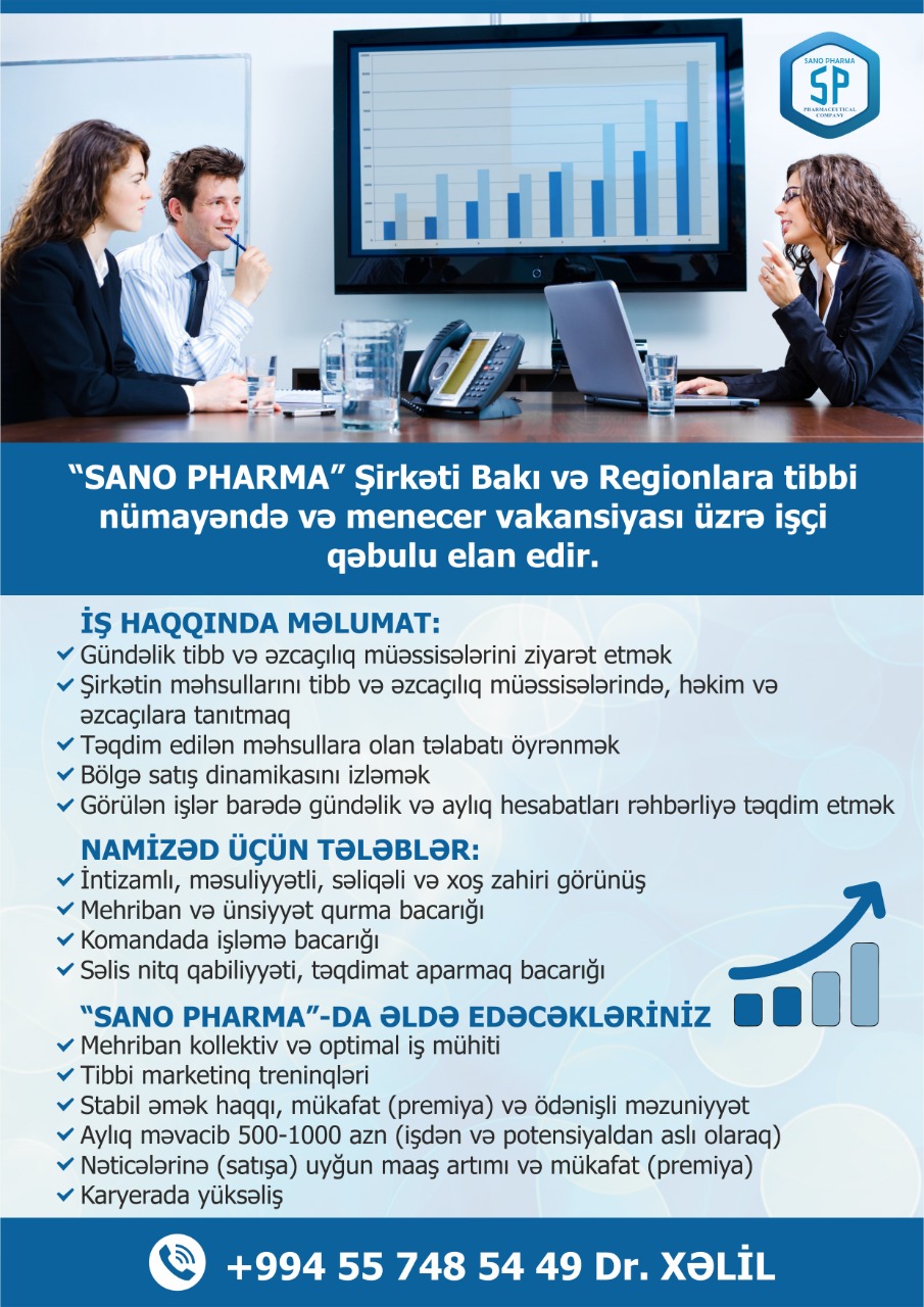 "SANO PHARMA" Şirkəti Bakı və Regionlara tibbi nümayəndə və menecer vakansiyası üzrə işçi qəbulu elan edir.